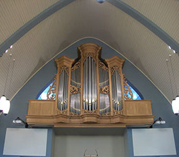 Organ History Almost simultaneously with the commissioning of the new church building in 1928 the organ was inaugurated. A Valkcx and Kouteren, built according to the then prevailing pneumatic cone drawer system, with eight votes and down pedal. The organ has been in service until 1993 but became especially after the expansion of the church building in 1982 (from 400 to approximately 620 seats) were too small. The limited capabilities and limited capacity occurred more and more funds. It is worth noting however that the organ the fate of many pneumatic organs, namely the scrap heap, was spared. Thanks to the efforts of Eastern Europe committee in Arnhem gave the organ a place in the Reformed. Church to Ilienie in Romania where it still serves every Sunday. Preparations new organ The growth of the congregation made considerations to split the church, double shifts or expansion of the church is necessary. The churchgoers on Sundays simply no longer fit in the building. It was expanding. The realization took place in 1982. The now recommended created organ committee after extensive consideration to the construction of a new organ. That order was given to the brothers. Hoogendoorn Enschede: BAC Orgelmakers. The already built instruments of this organ builder (such as Candlestick Church Heemse) left a great impression on the committee. Realization We opted for a real Dutch organ like that, particularly in the first half of the 19th century was built with clear recognition of the work of Bätz. The organ was given the primary task of guiding the congregation. In 1994 the new instrument was completed: 19 votes spread over two manuals and pedal, in a very well built with generous oak greenhouse carving. The labia of the front pipes were fitted with gold leaf. The location of the organ remained unchanged in the front of the church above the pulpit is still the most appropriate place for an organ! The organ builders were able to achieve in the (yet not too large) space under construction a parabola hoofdwerk- rugwerk. It would only promote the sound emission direction church hall. Some sound impressions: The church has a reasonable acoustics. However, this takes quite quickly when banks get filled. Nevertheless there is to sing well with a filled church. In man hours of construction and the intonation, the organ builder with this fact into account. In the construction of the plenum (full work) is that, even though soon. The instrument possesses a full, carrying sound of a mild nature. Both the main work as the uppers have a tremulant. The reeds have been very successful; the beautiful Dulciaan offers excellent party together with the sonorous trumpet 8'op the main work. Bassoon 16'van the pedal has funnel-shaped cups and put a solid foundation beneath the plenum but can also be used well beyond full employment. The purchase and arrangement of the reeds is paid much attention. The Cornet is a real "congregational vote" and associate strongly to the Bätzklank. A tingling Mixtuur crowns the whole. But the whistle can be heard many wonderful things. The combination 8/4/3 as yields on the upper, possibly with the Dulciaan hatching an alternative voice to the Cornet. All in all the whole is an organ with style and charisma. In recent years, were already several organ concerts by famous organists. Those entries in the guestbook witnessing great appreciation for the instrument. Marie Berg is happy! Moreover, it is an asset to the regional organ possession. source story: http://www.marienberg.gkv.nl/ |
