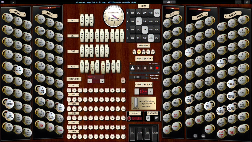 This organ has been very carefully sampled by us from selected largely untouched Henry Willis organs of very similar vintage from Liverpool and the immediate surrounding area. This organ is therefore a large composite organ made from more than one source organ, with a specification which takes it's influence from both the organ of St George's hall, Liverpool and Liverpool Anglican Cathedral. The organs the ranks have been sampled from in their own right are very fine and well known instruments and would more than stand alone as a good virtual organ, however in this case we wanted to build something grander, so have combined the best of the ranks and specifications. In particular, we wanted to be able to recreate the spirit of these two instruments but keep the organ at a size which still remains responsive in a virtual environment, so it was not practical to make a verbatim copy of either organ specification, nor replicate the shear number of stops! Whilst this virtual organ is a 4 manual instrument, it is still possible to fully utilize all manuals from a console with less than four manuals. 24 Bit Stereo and 5.1 surround sound (Studio Quality). Ranks recorded between 2007 and 2019 Tuning 440Hz |