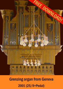 The church's organ was built in 2001 by Gerhard Grenzing who is a famous German organ builder living in Barcelona. This is a typical North German Baroque organ. Alain Grandchamp recorded the organ. Although this recording was made with care and a high-quality hardware, its treatment was exceptionally difficult and it was thus necessary to slightly limit the precision and the features of the sample-set. Some organs, because of a very noisy and irregular external traffic can not be well sampled. So is this instrument. Also a malicious but enthusiastic small animal (bird or cricket?), singing a strong and strident accompaniment behind some few stops did not facilitate the things either. This sample-set was thus a challenge. The Augustine’s V.O. assumed the finishing of this so ungrateful recording and the making of the sample-set. |